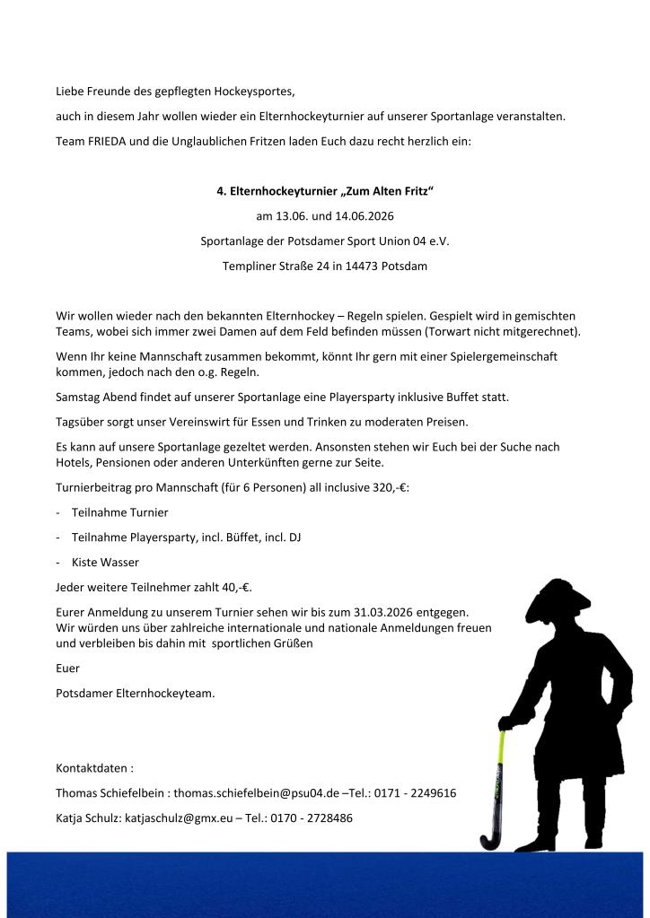 Elternhockeyturnier „Zum Alten Fritz“ in Potsdam am 13./14.06.2026